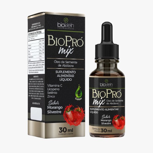 BIOPRO MIX ÓLEO SEMENTE ABOBORA BIOKLEIN MORANGO SILV 30ML GOTAS é um suplemento a base de Óleo de Semente de Abóbora obtido através da prensagem a frio da semente desta, preservando assim seus nutrientes (ácidos graxos, principalmente mono e poli-insaturados) e por consequência propriedades nutricionais.