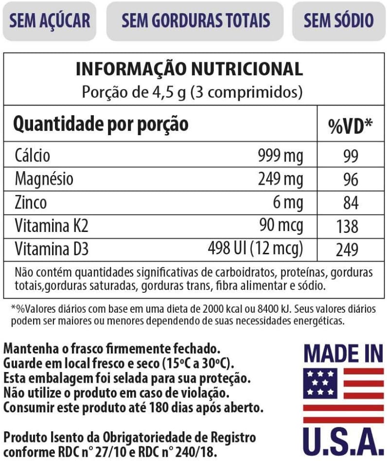 | Composição: | Carbonato de cálcio e citrato de cálcio, menoquinona-7, colecalciferol, óxido de magnésio, sulfato de zinco, ácido esteárico, carboximetilcelulose sódica, estearato de magnésio e glicerina. |