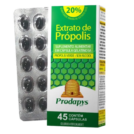 Cada cápsula contem 50mg de Extrato Seco de Própolis verde, que equivale a 10 gotas de Extrato de Própolis Prodapys.