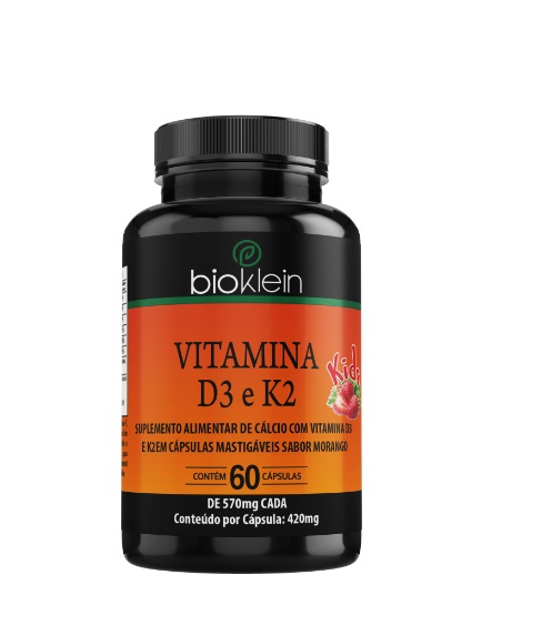 Vitamina D3 e K2 Kids da Bioklein é um suplemento em cápsulas mastigáveis indicado para crianças, com delicioso sabor Morango. Vitamina D3 em associação com Vitamina K2 são responsáveis pela absorção e direcionamento do cálcio para o tecido ósseo impedindo o seu depósito em locais não benéfico, como as artérias, órgãos e articulações. Segundo pesquisas crianças com níveis adequados de vitamina D3 no organismo, raramente são infectadas pela gripe e resfriado.